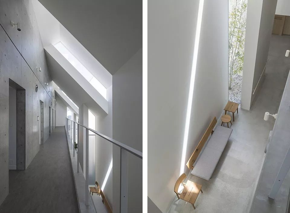 为了获得最大的面积,建筑几乎占满整个L型场地,其两个入口面采用了人们熟悉的坡屋顶小屋造型,此外建筑可以看做这些大小不一的坡屋顶建筑侧墙面在一起的组合。这些组合件的错缝,也就是建筑师在建筑体量上开出的动感凹槽,为建筑带来了自然光,也保证了用户的隐私,最为重要的是,这个设计能紧密联系外部空间和内部空间,让病人感到放松。